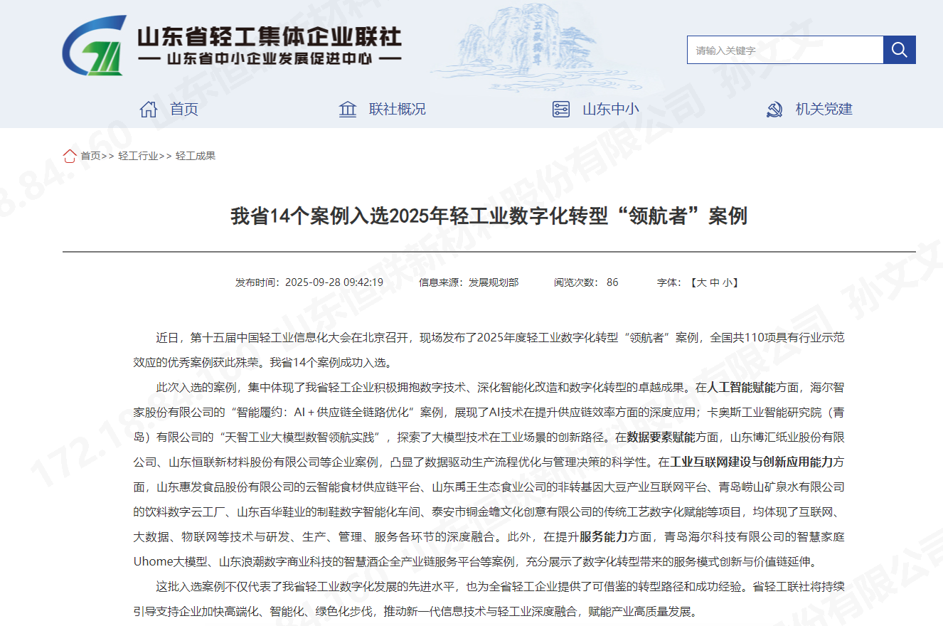 喜報丨山東恒聯新材料股份有限公司入選2025年度中國輕工業數字化轉型“領航者”案例:以“智能+綠色”書寫行業新標桿