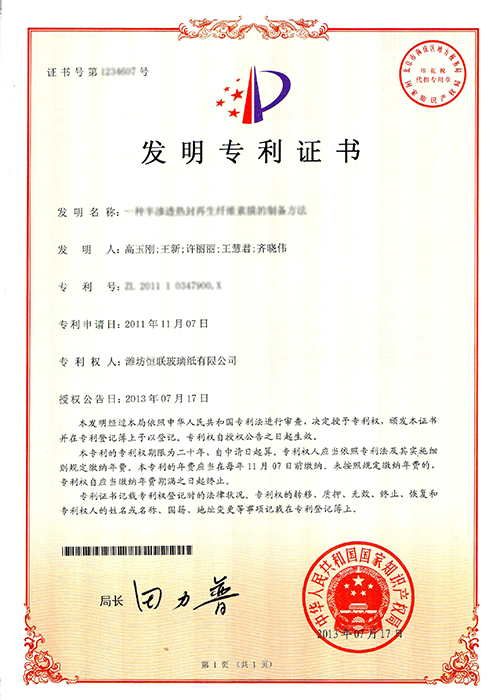 半滲透高熱封再生纖維素膜——被列入“2011年山東省第一批技術創新項目計劃”(魯經信技字[2011]88號),已通過山東省級科技成果鑒定。